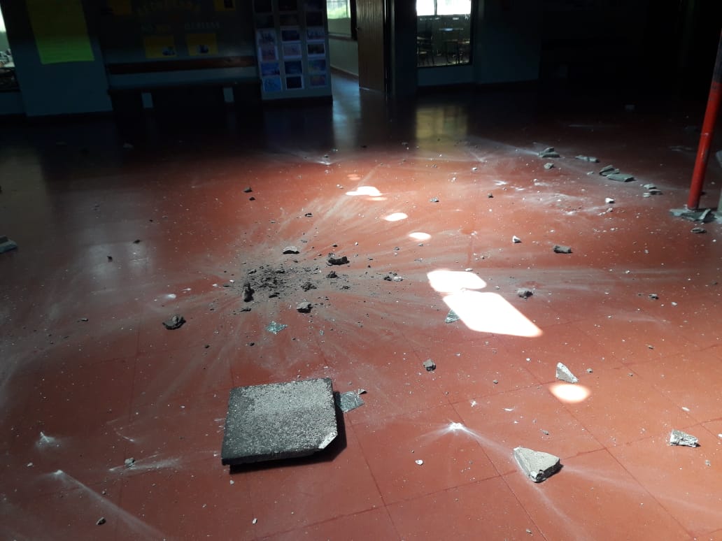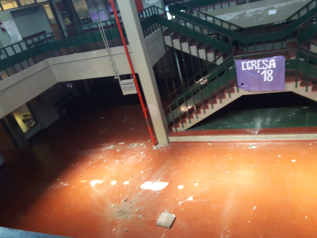 Como se aprecia en la imágenes, los vándalos rompieron los vidrios de la terraza que da al hall central del edificio y de allí arrojaron pedazos de baldosas. Se sabe además que no ingresaron al edificio ya que los vidrios que rompieron se encuentran a una altura considerable, pero si generaron daños en ese sector del colegio.