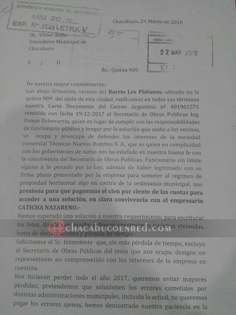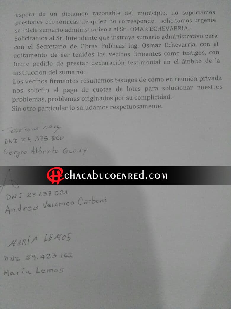Chacabuco en Red tuvo acceso a esa nota en la que los vecinos de la quinta 909 aseguran que el secretario de Obras Públicas, Osmar Echevarría “