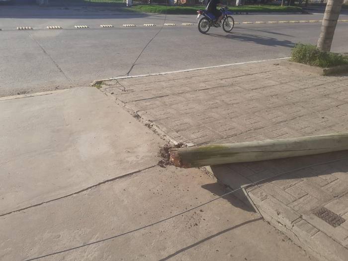 A raíz de la maniobra, se quebró un poste ubicado en el lugar, que quedó inclinado que en un primer momento no llegó a caer. Tras varios minutos la situación se agravó: un camión que circulaba por la zona volvió a enganchar el cable, lo que terminó provocando que el poste cayera sobre la vereda con los cables atravesando la calle Cadelago, generando un riesgo para quienes transitan por el sector.
