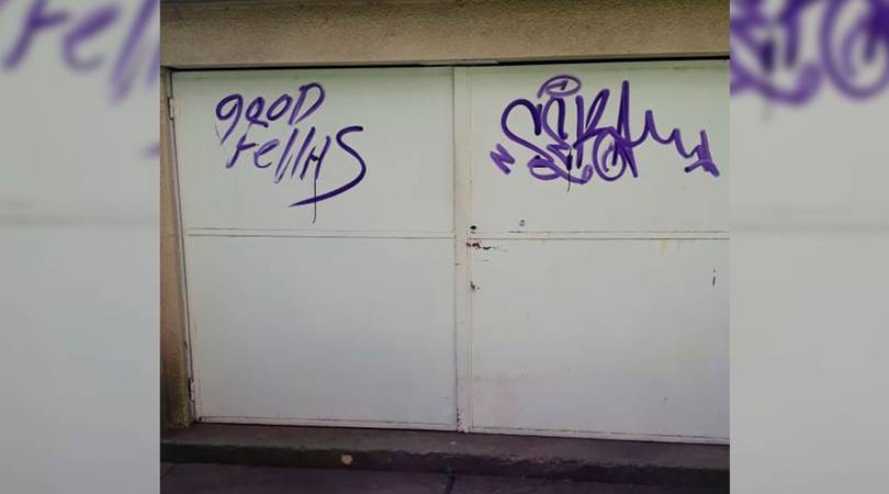 Anoche, dos jóvenes pintaron sobre el frente del edificio ubicado en Primera Junta y Zapiola un grafitti que dice “GoodFellas”.