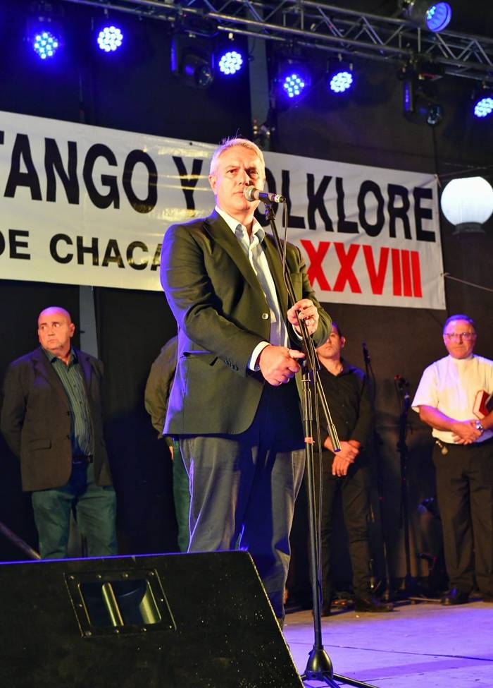 El Intendente Municipal, Darío Golía, encabezó esta noche la apertura oficial del XXVIII Festival Provincial de Tango y Folklore, acompañado en el escenario por la comisión directiva de Músicos Unidos, el Secretario de Gobierno, Lic. Javier Estévez, el Secretario de Seguridad, Dr. Gustavo Masci, y la Subsecretaria de Cultura, Julieta Pederzoli.