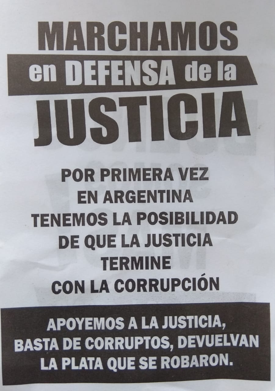 La marcha será mañana a las 19 horas en Plaza San Martín. “Marchamos en defensa de la Justicia. Por primera vez en la Argentina tenemos la posibilidad de que la Justicia termine con la corrupción”, dice el folleto.