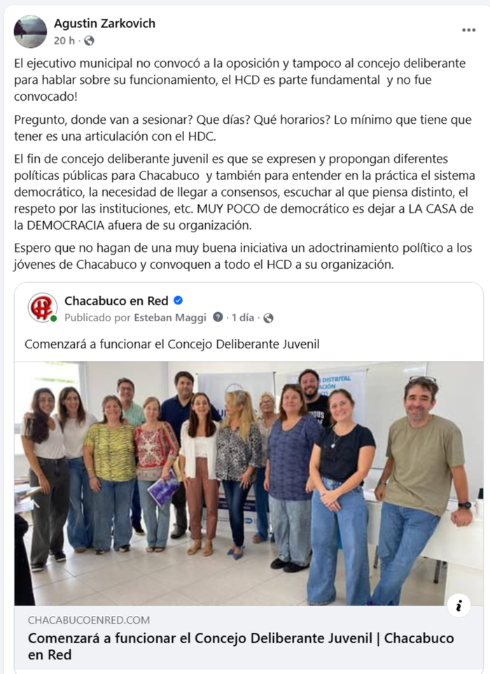 Finalmente, advirtió sobre la importancia de que el proceso sea amplio y participativo. “Muy poco de democrático es dejar a la casa de la democracia afuera de su organización. Espero que no hagan de una muy buena iniciativa un adoctrinamiento político a los jóvenes de Chacabuco y convoquen a todo el HCD a su organización”.
